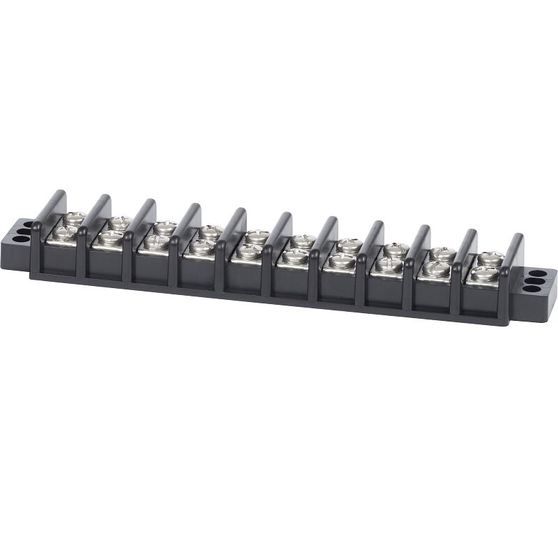 Blue Sea Terminal blok 30A met 10 circuits. Ontwerp met gesloten achterkant isoleert de stroom volledig van het montageoppervlak. Elk schroevenpaar is één geïsoleerd circuit.