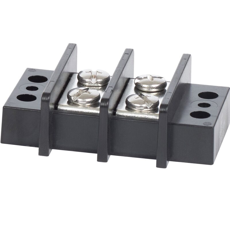 Blue Sea Terminal blok 65A met 2 circuits. Ontwerp met gesloten achterkant isoleert de stroom volledig van het montageoppervlak. Elk schroevenpaar is één geïsoleerd circuit.