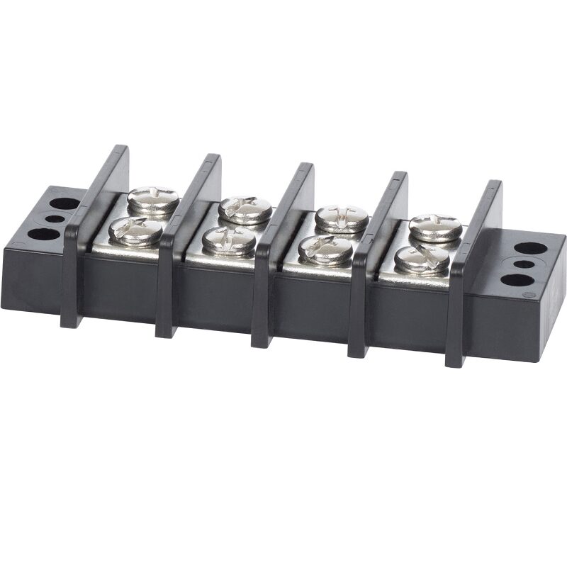 Blue Sea Terminal blok 65A met 4 circuits. Ontwerp met gesloten achterkant isoleert de stroom volledig van het montageoppervlak. Elk schroevenpaar is één geïsoleerd circuit.